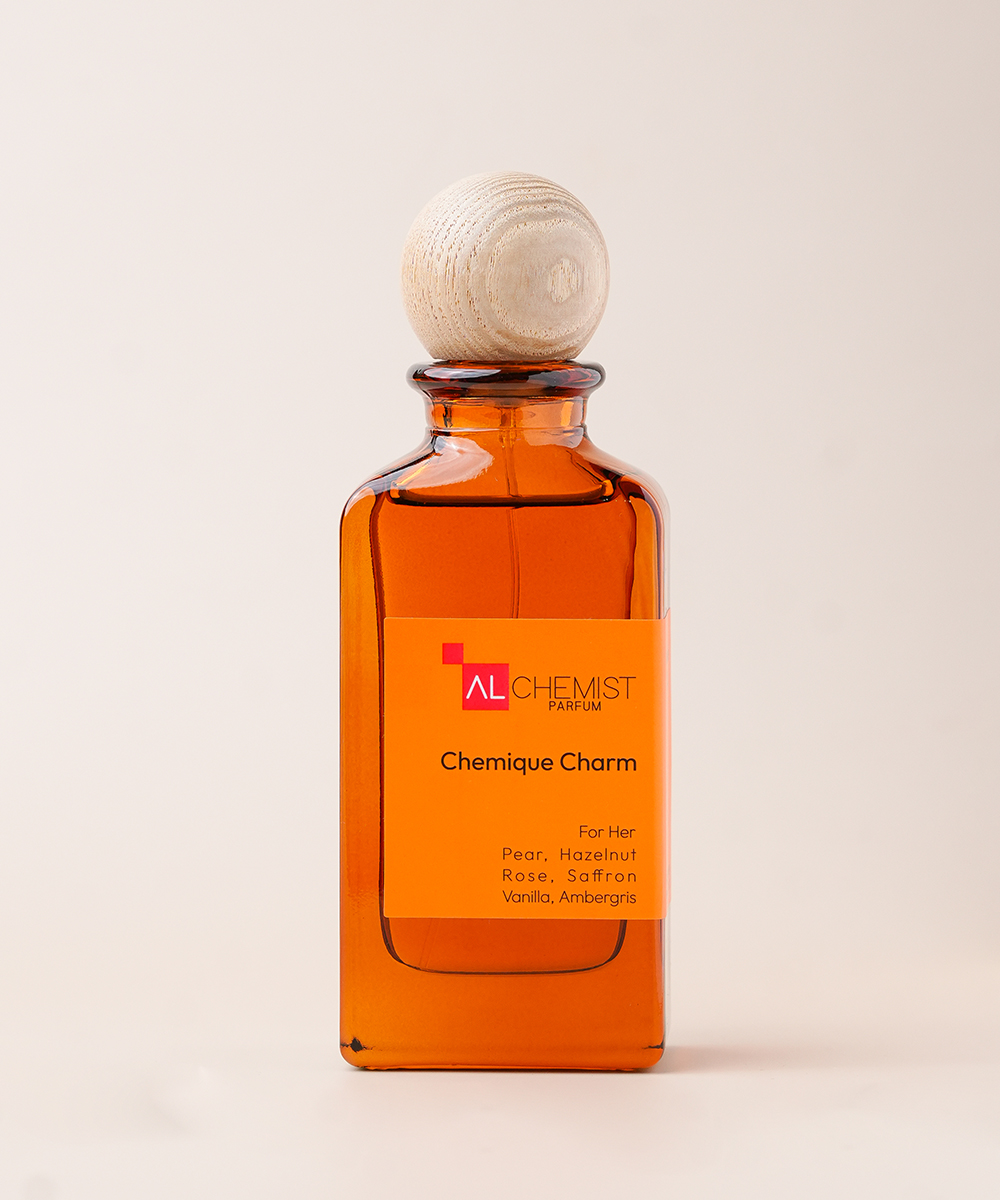Chemique Charm by Alchemist Parfum For Her – A Captivating Blend of Sweet Elegance and Warm Sophistication Chemique Charm is a fragrance for the woman who captivates effortlessly—elegant, mysterious, and unforgettable. This luxurious blend opens with a delightful twist of pear and hazelnut, adding a juicy sweetness and nutty warmth that feels both inviting and playful. The heart of the fragrance reveals a rich floral core—rose kissed with the exotic spice of saffron. This fusion creates a sophisticated bouquet that is both soft and sultry, leaving behind a trail of refined femininity. The base is indulgent and deeply sensual, anchored by creamy vanilla and the timeless, oceanic mystique of ambergris. Together, they create a lasting impression that feels warm, comforting, and undeniably alluring. Fragrance Notes: